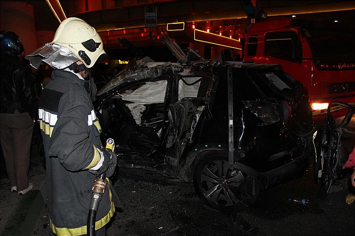 جلال ملکی، سخنگوی آتش‌نشانی تهران در رابطه با این خبر گفت: ماموران آتش‌نشانی بلافاصله خود را به محل حادثه رساندند. بررسی‌های میدانی نشان می‌داد یک خودروی لکسوس با یک خودرو اسپورتیج در لاین کندرو برخورد کرده است. شدت برخورد به‌حدی بود که دو سرنشین خودروی اسپورتیج و همچنین راننده خودروی لکسوس در میان ستون‌های درهم پیچیده شده خودروها گرفتار شده بودند. ماموران آتش‌نشانی سریع دست به کار شدند و پس از ایمن‌سازی‌های اولیه و هدایت کردن خودروهای عبوری با استفاده از قیچی آهنبر ابتدا ستون‌های درهم پیچیده شده خودروی اسپورتیج را برش داده و هر دوسرنشین خودرو را که یک زوج ٢٨ساله به نام ایمان ولی‌زاده و یاسمین وزیری بودند از درون اتاقک درهم پیچیده خودرو خارج کرده و تحویل عوامل اورژانس حاضر در محل حادثه دادند.