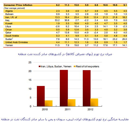 از سویی بسیاری از صادرکنندگان نفت در این منطقه میزان نرخ تورمی کمتر از 5 درصد را در سال 2011 به ثبت رساندهاند ولی در کشورهایی مانند یمن، لیبی و سودان به نظر مسائلی همچون کاهش ارزش پول علت اساسی نرخ تورم بالا بوده است که تا مرز 20 در صد هم رسیده. بنا بر گزارشی که صندوق بینالمللی پول در آوریل سال جاری منتشر ساخته نرخ تورم ایران در سال 2011 به دلیل افزایش قیمت ناشی از اجرای طرح هدفمندی یارانهها به بیش از 21 درصد رسیده.