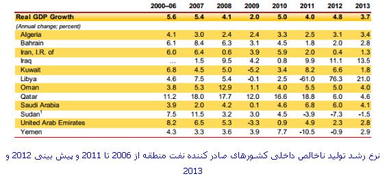 بنا بر آمار نهادهای بینالمللی در تعدادی از کشورهای منطقه از جمله ایران و عراق و کویت و لیبی در سال 2011 میزان تولید ناخالص داخلی به مرز 4 درصد نزول کرد. در این میان بسیاری از کشورهای صادر کننده نفت در منطقه، شاهد رشدی سریعتر در تولید ناخالص داخلی غیر نفتی بودهاند که علت اصلی آن هزینه کرد بیشتر دولت در این بخشها بوده.