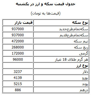 نرخ فروش هر قطعه سکه تمام بهار آزادی طرح جدید و قدیم روز یکشنبه در بازار 937 هزارتومان، نیم سکه 472 هزارتومان، ربع سکه 268 هزارتومان و سکه گرمی 172 هزارتومان اعلام شد.