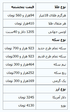 در بازار امروز هر گرم طلای 18 عیار به قیمت 94هزار و 560 تومان و سکه تمام به قیمت 923 هزار و 700 تومان داد و ستد میشود.