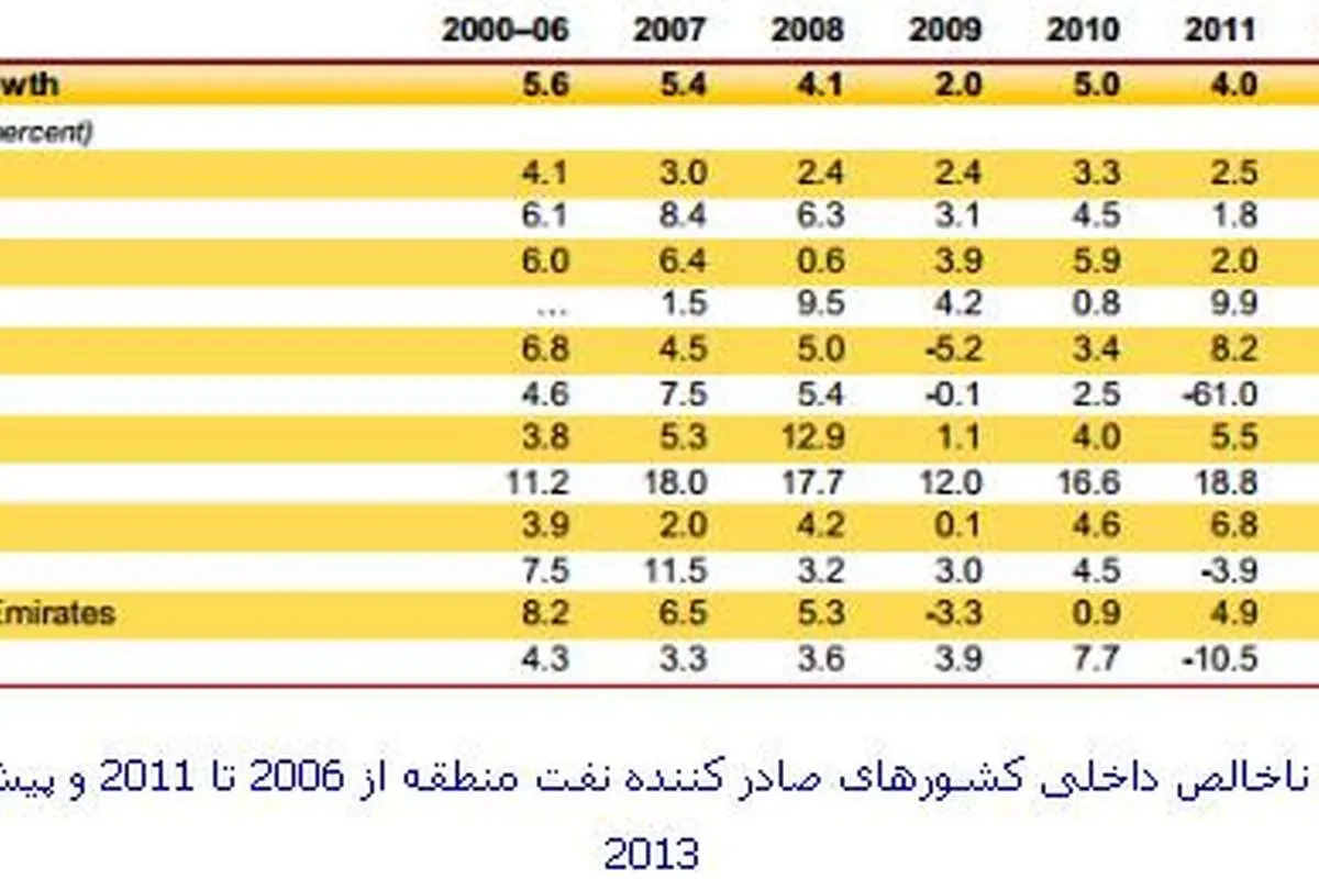 بنا بر آمار نهادهای بینالمللی در تعدادی از کشورهای منطقه از جمله ایران و عراق و کویت و لیبی در سال 2011 میزان تولید ناخالص داخلی به مرز 4 درصد نزول کرد. در این میان بسیاری از کشورهای صادر کننده نفت در منطقه، شاهد رشدی سریعتر در تولید ناخالص داخلی غیر نفتی بودهاند که علت اصلی آن هزینه کرد بیشتر دولت در این بخشها بوده.