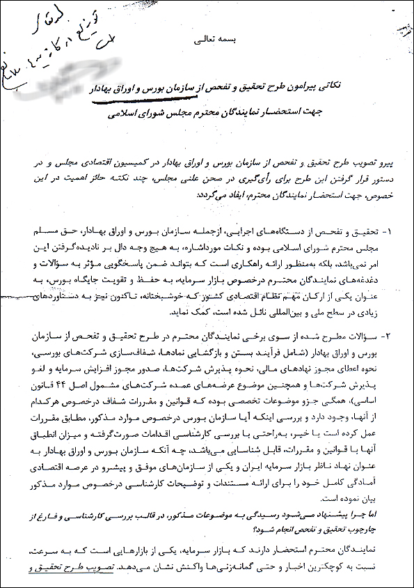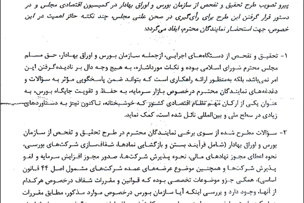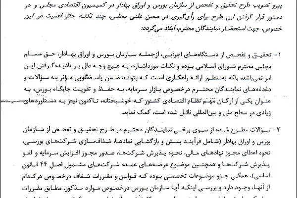 متن این نامه به این شرح است: پیرو تصویب طرح تحقیق و تفحص از سازمان بورس و اوراق بهاداردر کمیسیون اقتصادی مجلس و در دستور قرار گرفتن این طرح برای رایگیری در صحن علنی مجلس، چند نکته حائز اهمیت در این خصوص، جهت استحضار نمایندگان محترم ایفادمیگردد: