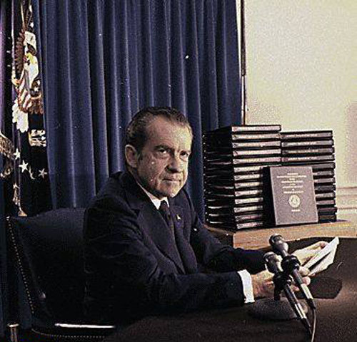 - ریچارد میلهوس نیکسون، دومین رییس جمهوری بد آمریکاست؛ وی که متولد 1913 میلادی بود سی و هفتمین رئیسجمهور ایالات متحده محسوب میشود. نیکسون در سال 1994 میلادی درگذشت. همچنین در دوران ریاست جمهوری وی که از سال 1969 تا 1974 میلادی به طول انجامید، جنگ ویتنام صورت گرفت که طی آن بسیاری از سربازان آمریکایی کشته شدند. نیکسون اولین رئیسجمهوری آمریکا در میان 44 رئیسجمهور دیگر این کشور محسوب میشود که به دلیل رسوایی واترگیت استعفا کرد. این رسوایی که باعث استعفای نیکسون شد به این شرح است: در جریان انتخابات ریاست جمهوری ایالات متحده آمریکا تعدادی از ماموران افبیآی وارد ساختمان هتل واترگیت، محل استقرار ستاد انتخاباتی حزب دموکرات آمریکا شدند و دستگاههای شنود کار گذاشتند و سپس اسناد و مدارکی را برای اهداف مختلف به سرقت بردند. این اقدام غیر قانونی با پیدا شدن یک نوار کاست توسط یک مأمور حراست هتل به طور تصادفی لو رفت و روزنامه واشنگتن پست از طریق دو تن از روزنامه نگاران خود به نامهای باب وودوارد و برنشتاین آن را به اطلاع افکار عمومی رساند.