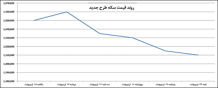 همزمان با افت قیمت جهانی طلا، نمودار قیمتی در روزهای منتهی به 22 اردیبهشت‌ماه، نشان می‌دهد قیمت سکه در یک منحنی نزولی حرکت کرده و تنها یک روز پیش از آغاز ثبت‌نام است که قیمت سکه بهار آزادی طرح جدید صعودی بوده است. در‌بقيه روزها، قیمت سکه روند رو به کاهش داشته و اوج آن هم در روز آخر ثبت‌نام بوده است.