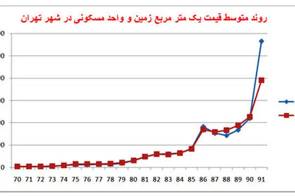 متوسط قیمت یک متر مربع واحد مسکونی معامله شده در شهر تهران نیز که ابتدای سال 84،587هزار تومان بوده است در پایان سال 91 به 3.9 میلیون تومان بالغ گردیده است. یعنی قیمت مسکن با نرخ رشد نزدیک به 27 درصد به طور سالانه، بیش از 6 برابر افزایش یافته است.
