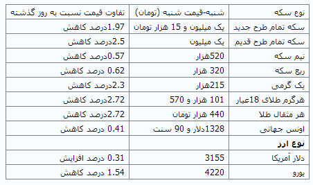براساس آخرین تغییرات قیمتی امروز شنبه قیمت سکه و طلا نسبت به آخرین روز کاری در هفته گذشته کاهش یافت.