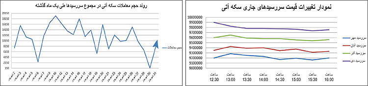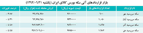 در این روز بهای سکه نقدی تقریبا با قیمت روز قبل از آن برابری می‌کرد و حتی برای ساعاتی از آخرین قیمت ثبت شده روز شنبه بیشتر بود؛ اما مجددا به کانال ریزش بازگشت. دلار نیز در بازار آزاد صبح روز گذشته کمی افزایش قیمت داشت و پس از آن همانند سکه پایین آمد تا باز هم به زیر 2900 تومان برسد. در این بین سکه‌های آتی هرچند به روند ریزشی خود ادامه دادند، اما از شدت آن کاستند و با نوسانات فراوان موجب شدند تا معامله‌گرانی که روز شنبه تنها در نیم ساعت اولیه شروع این بازار به معامله پرداخته بودند و باقی این روز از بازار آتی سکه کنار کشیدند، روز گذشته مجددا وارد داد و ستد شوند.