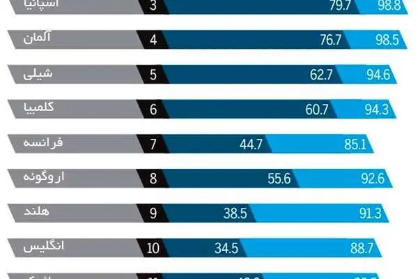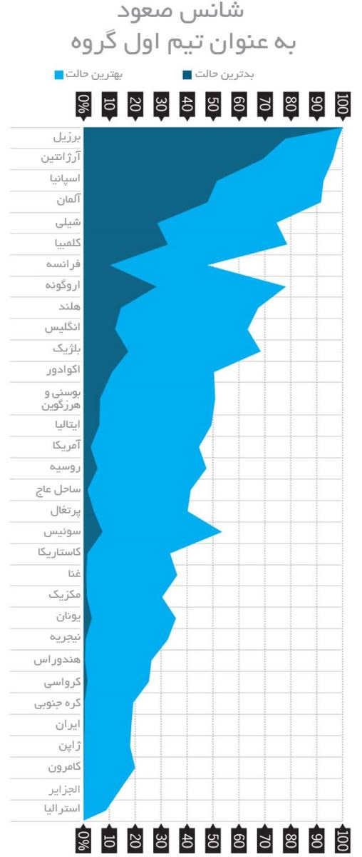 در اینفوگرافی پایانی هم شانس 32 تیم حاضر در رقابتهای جام جهانی برای کسب مقام اول گروه خود و صعود به مرحله یک هشتم نهایی به عنوان تیم نخست گروه محاسبه شده است. به عنوان مثل تیم ملی برزیل میزبان رقابتها در "بهترین حالت" و "بدترین حالت" شانسی نزدیک به 100 درصد برای صعود به عنوان تیم اول گروه دارد.