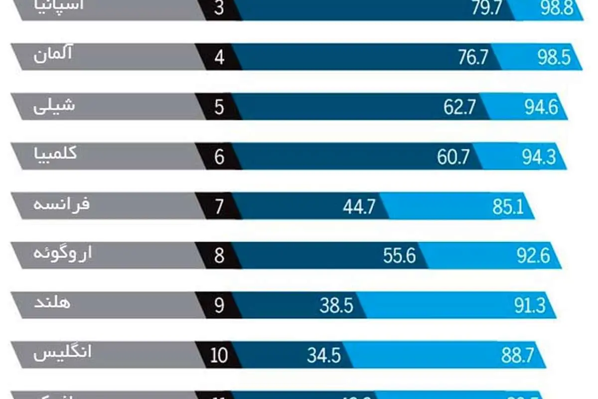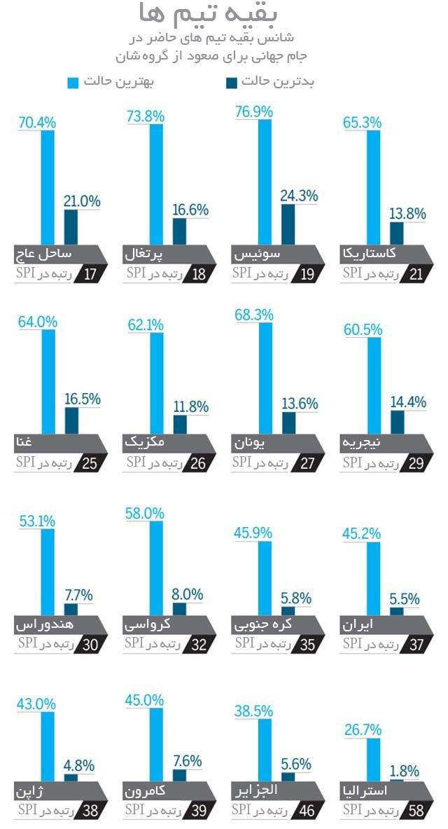 در قسمت دوم شانس بقیه تیمهای حاضر در رقابتهای جام جهانی در دو حالتی که در بالا توضیح داده شده، برای صعود از گروهشان مشخص شده است که شانس تیم ملی ایران در بهترین حالت و آسانترین قرعه 45.2 درصد و در سختترین قرعه ممکن 5.5 درصد خواهد بود.