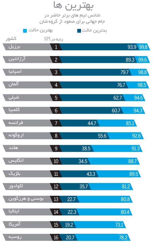 در اینفوگرافی اول شانس 16 تیم نخست ردهبندی SPI برای صعود از گروهشان در دو حالت بررسی شده است. حالت اول بهترین قرعه ممکن برای تیم است که با عبارت "بهترین حالت" مشخص شده و حالت دوم سختترین قرعه ممکن برای تیم است که با عبارت "بدترین حالت" مشخص شده است: