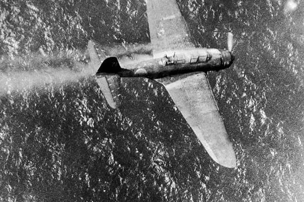 خلبان از جان گذشته "کانیکازه" ژاپنی هواپیمای آتش گرفته خود را به سمت ناو هواپیمابر امریکایی در نزدیکی جزایر فیلیپین هدایت می کند. اکتبر 1944
