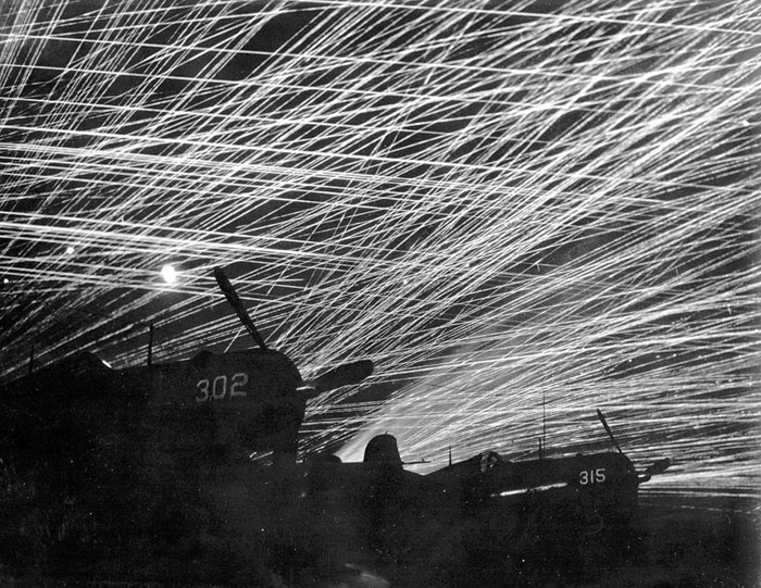 آتش ضدهوایی بر فراز فرودگاه "یونتون" در اوکیناوا. آوریل 1945