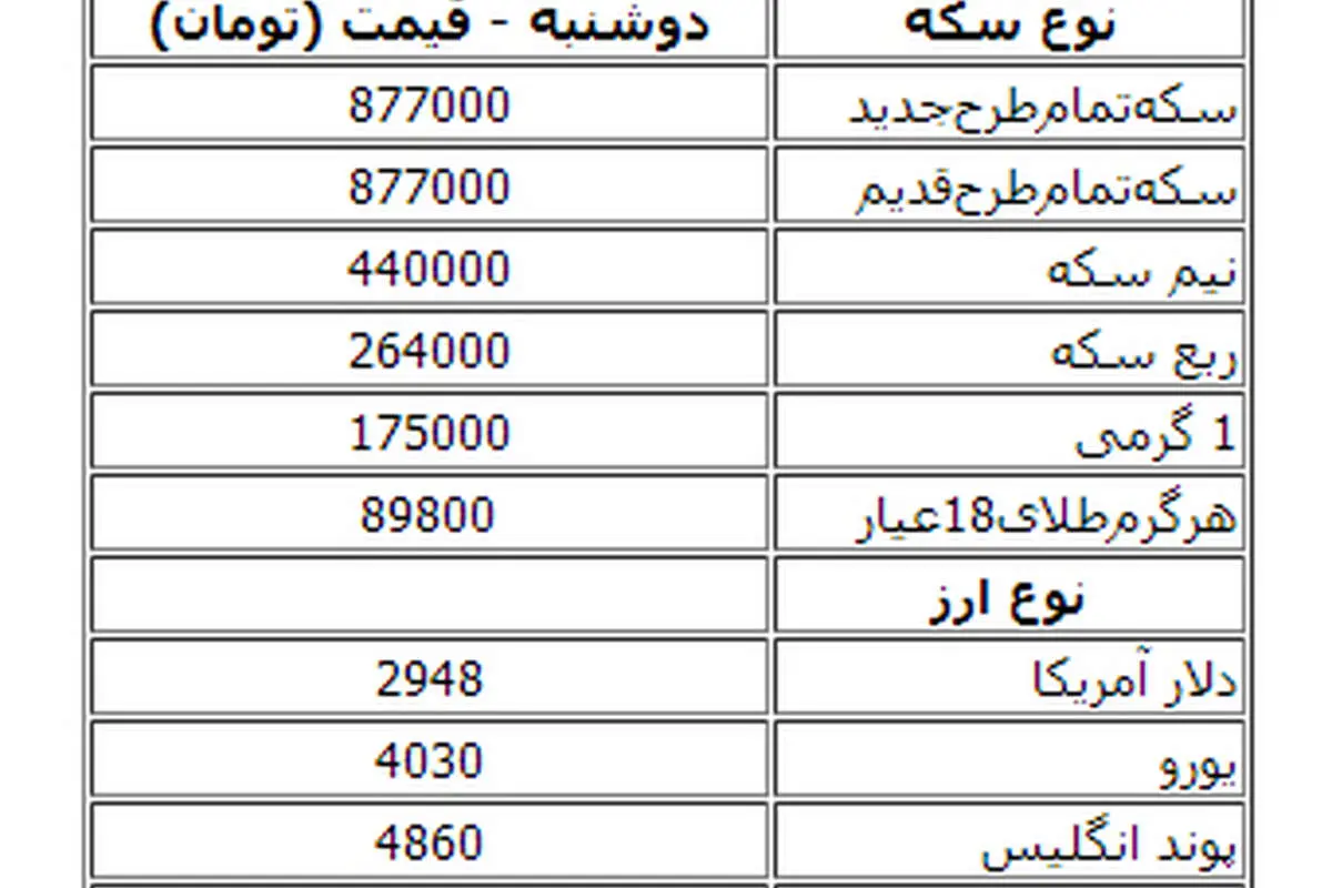 جدول قیمت سکه و ارز