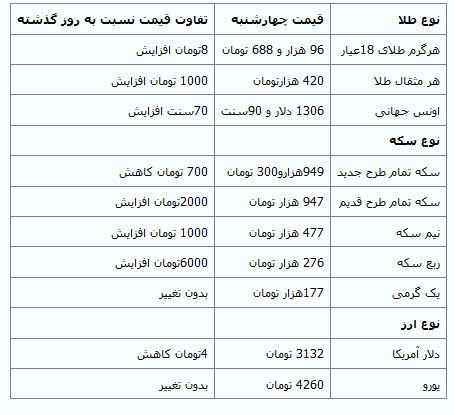 بر این اساس ربع سکه به قیمت 276 هزار تومان و هر دلار آمریکا در بازار آزاد نیز 3132 تومان است.