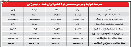 قیمت مسکن نسبت به درآمد ایرانیها؛ ٢ برابر هند، ٥/٣ برابر ترکیه و ٥/٢ برابر ژاپن و قیمت هر مترمربع مسکن ایران حدود ٢ برابر هند و ترکیه و نصف ژاپن است | هزینه اجاره مسکن در ایران حدود ٣ برابر هند و ٢ برابر ترکیه است | لیزینگ مسکن در ژاپن ١٠٠ ساله است | هند یکی از بزرگترین بازارهای لیزینگ مسکن در دنیا را دارد