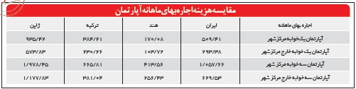 *توضیح: مقایسه اجاره بهای ماهانه یک واحد آپارتمان در بین ٤ کشور هدف گویای این نکته است که اگر بخواهید در مرکز شهر یا خارج از شهر در ایران خانهای داشته باشید باید حدود ٣ برابر هند حدود ٢ برابر ترکیه و تقریبا نصف هزینه ژاپنیها، دلار خرج کنید. هرچند که متراژهای متفاوت نسبتهای متفاوتی دارد.
