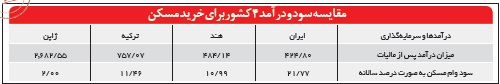 توضیح: مقایسه نرخ سود تسهیلات مسکن ایران با هند و ترکیه حکایت ٢ برابر بودن نرخ در ایران دارد اما درحالیکه قیمتها در ایران بالاتر و میزان دسترسی به وام پایینتر از ٣ کشور دیگر است، نرخ سود ایران ١٠ برابر بیشتر از ژاپن است؛ حال آنکه میزان درآمدهای ایرانیان کمتر از این کشورهاست.