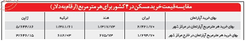 توضیح: درباره خرید آپارتمان نیز شرایط تقریبا مشابه است و قیمت هر مترمربع مسکن در ایران حدودا ٢ برابر هند و ترکیه است و نصف ژاپن است. در این مقایسه هم تنها قیمتها در ژاپن بالاتر از ایران است.