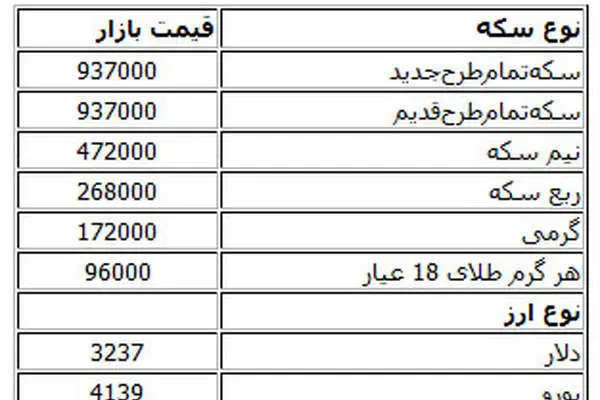 نرخ فروش هر قطعه سکه تمام بهار آزادی طرح جدید و قدیم روز یکشنبه در بازار 937 هزارتومان، نیم سکه 472 هزارتومان، ربع سکه 268 هزارتومان و سکه گرمی 172 هزارتومان اعلام شد.