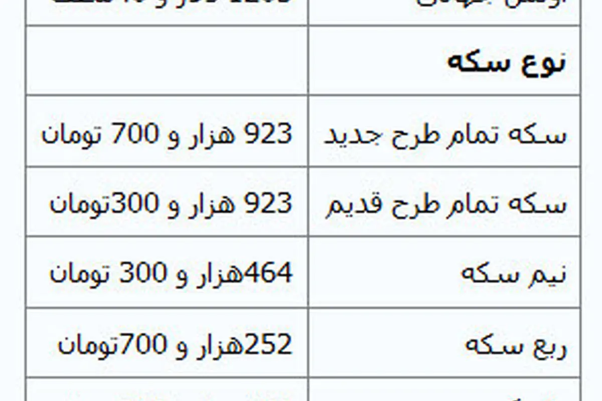 بر این اساس قیمت نیم سکه 464 هزار و 300 تومان و هر دلار آمریکا در بازار آزاد 3245 تومان نیز است.