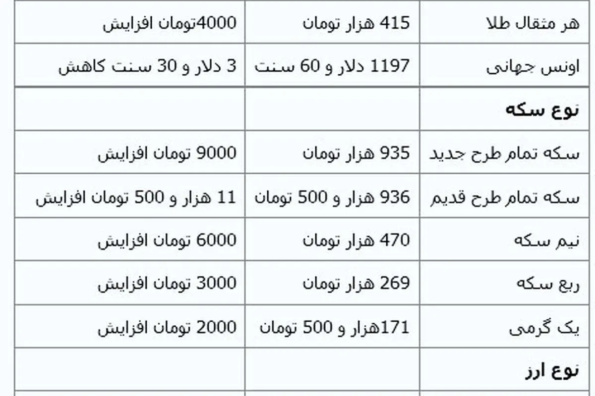 در بازار امروز - چهارشنبه - هر گرم طلای 18 عیار به قیمت 95 هزار و 713 تومان و سکه تمام طرح جدید به قیمت 936 هزار و 500 تومان داد و ستد می شود که نسبت به روز گذشته افزایش یافته است.