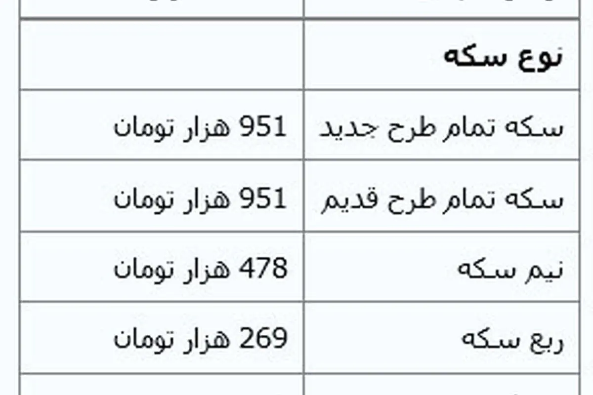در بازار امروز - شنبه - هر گرم طلای 18 عیار به قیمت 97 هزار و 212 تومان و سکه تمام به قیمت 951 هزار تومان داد و ستد می شود.