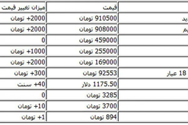 امروز سکه بهار آزادی طرح جدید با ۲ هزار تومان افزایش ۹۱۰ هزار و ۵۰۰ تومان و نرخ دلار بدون تغییر ۳۲۸۵ تومان به فروش رسید.