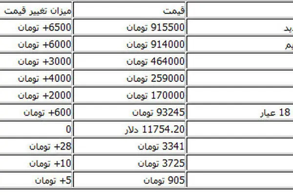 سکه طرح جدید با 6500 تومان افزایش 915 هزار و 500 تومان، سکه طرح قدیم با 6 هزار تومان افزایش 914 هزار تومان و نیم سکه با 3 هزار تومان رشد 464 هزار تومان فروخته شد.