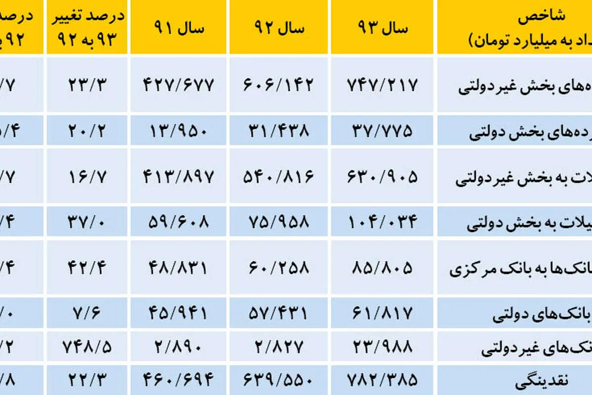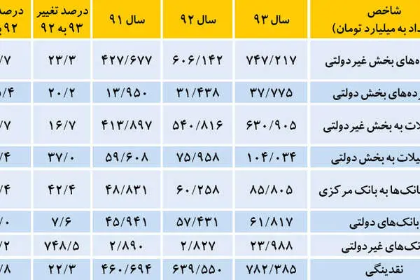بانک مرکزی آمار مصارف و منابع شبکه بانکی در سال 1393 را به تفکیک «بانکهای تجاری»، «بانکهای تخصصی» و «بانکهای غیردولتی و موسسات غیربانکی» منتشر کرد. مطابق این آمار، میزان کل داراییها و بدهیهای شبکه بانکی کشور در پایان سال گذشته به حدود 1630 هزارمیلیارد تومان رسیده که در مقایسه با پایان سال 1392، حدود 1/ 17 درصد افزایش یافته است.این آمار نشان میدهد از کل داراییها و بدهیهای شبکه بانکی، حدود 16 درصد متعلق به بانکهای تجاری، حدود 21 درصد متعلق به بانکهای تخصصی و حدود 63 درصد نیز، متعلق به بانکهای غیردولتی و موسسات غیربانکی است.در تقسیمبندی کنونی شبکه بانکی، سه بانک «سپه»، «پستبانک» و «ملی» در گروه «بانکهای تجاری» قرار میگیرند، گروه «بانکهای تخصصی» شامل پنج بانک «توسعه صادرات»، «صنعت و معدن»، «کشاورزی»، «مسکن» و «توسعه تعاون» است و سایر بانکها و موسسات مجاز نیز، در زیرمجموعه گروه «بانکهای غیردولتی و موسسات غیربانکی» قرار میگیرند.