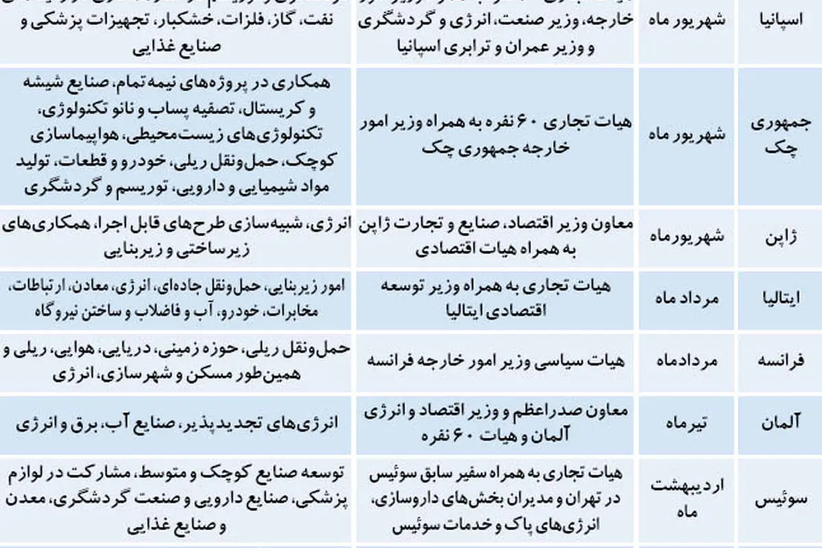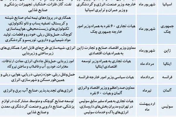 پیش از توافق وین، هیاتهای تجاری مختلفی از آلمان، فرانسه، ژاپن، ایتالیا، جمهوری، چک، اسپانیا و اتریش وارد ایران شدند. محور گفتوگوی اصلی این هیاتها، سرمایهگذاری مشترک با ایران و حضور طولانی مدت در بازار ایران بود. البته هیاتهای دیگری از سایر کشورها در سطوحی پایینتر وارد ایران شده و با بخش خصوصی دیدار کردند.