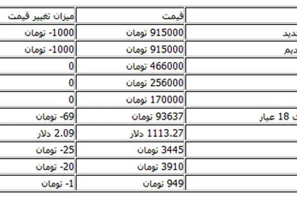 نیم سکه 466 هزار تومان، ربع سکه 256 هزار تومان و سکه گرمی 170 هزار تومان به فروش رسیدند و هر گرم طلای 18 عیار با 69 تومان کاهش 93 هزار و 637 تومان عرضه شد.