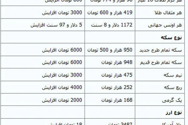 هر گرم طلای 18 عیار نیز نزدیک به 97 هزار تومان داد و ستد می‌شود و نیم و ربع سکه به ترتیب 475 و 252 هزار تومان قیمت دارند که روند افزایشی قیمت را نشان می‌دهند.