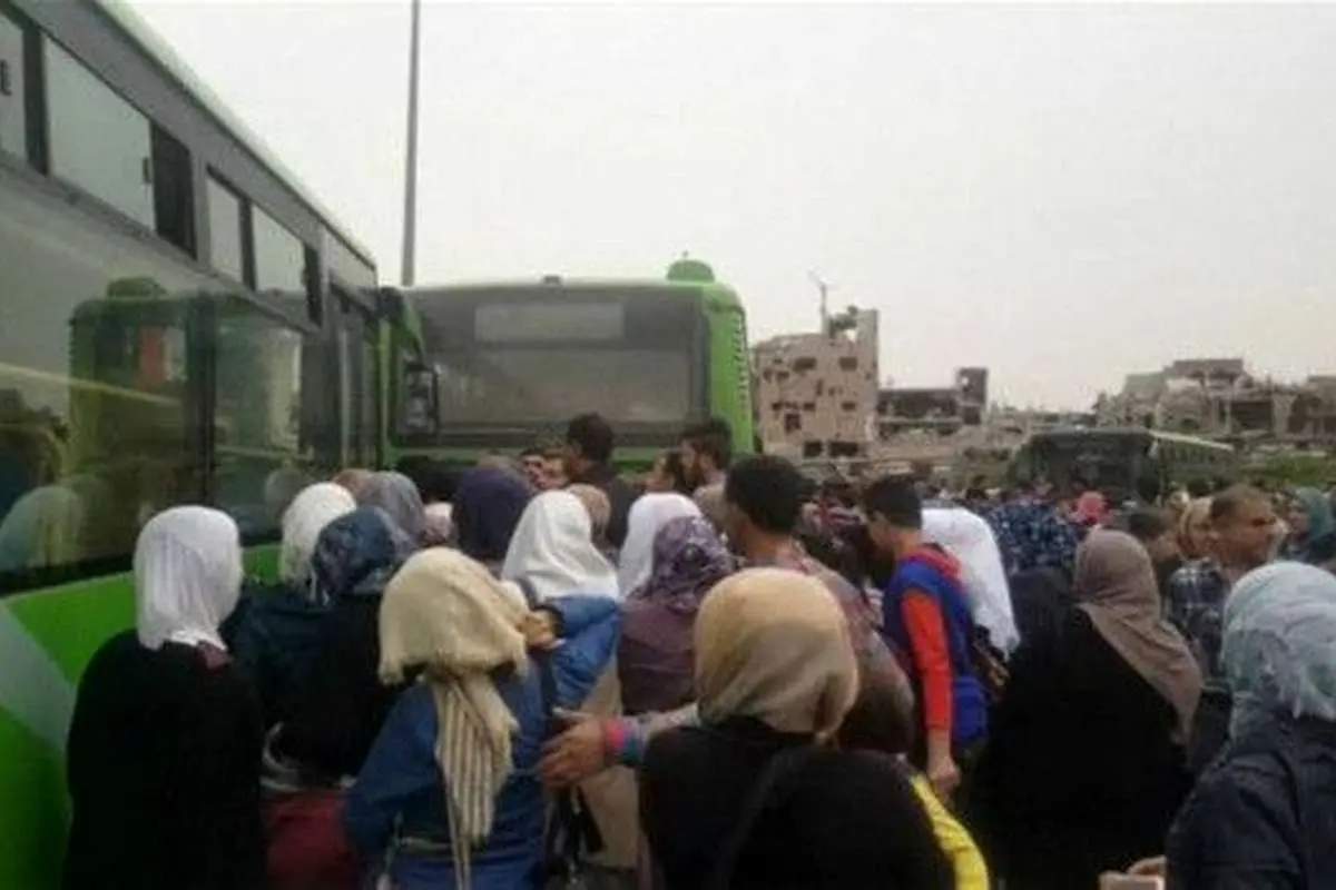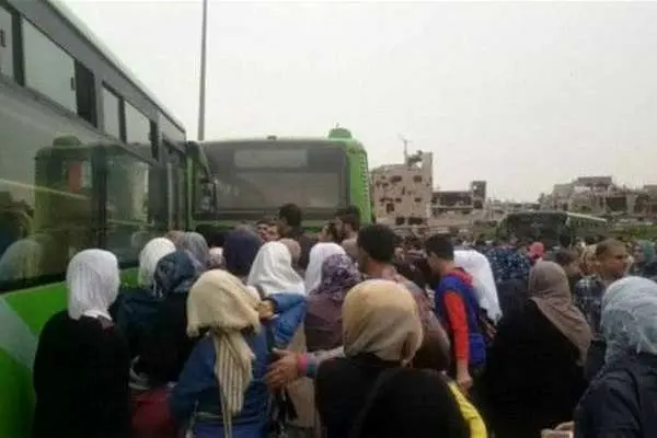 اتوبوس هایی که دولت سوریه فراهم کرده هزاران نفر از ساکنان را به القریتین و شهر تدمر - که محوطه باستانی پالمیرا در کنار آن است - منتقل کرده اند.