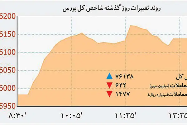 بازار سهام بعد از روزها قرمزپوشی و با چرخشی آرام روز گذشته توانست رشد 156واحدی را به ثبت برساند.نماگر بورس در حالی به سطح 76 هزار و 138 واحد رسید که این روزها، کاهش نقدینگی بزرگ‌ترین مشخصه بازار به شمار می‌رود. روز گذشته بار دیگر در نمادهای خودرویی شاهد تشکیل صف‌های خرید بودیم. این در حالی است که روز چهارشنبه و در آخرین ساعات، صف‌های فروش این نماد‌ها، جمع آوری شده بودند.در روز شنبه سه نماد «خودرو»، «وغدیر» و «وپاسار» در مجموع و حدود 115 واحد، بیشترین تاثیر مثبت را بر شاخص کل گذاشته و نمادهای «پارسان» و «فارس» منفی‌کننده‌های شاخص کل بودند. همچنین در روز اخیر، «کگاز» بیشترین افزایش قیمت و «قلرست» بیشترین کاهش قیمت روزانه را به ثبت رساندند. سرمایه‌گذاری سایپا در اولین روز هفته بیشترین ارزش و حجم معاملات را به خود اختصاص داد.