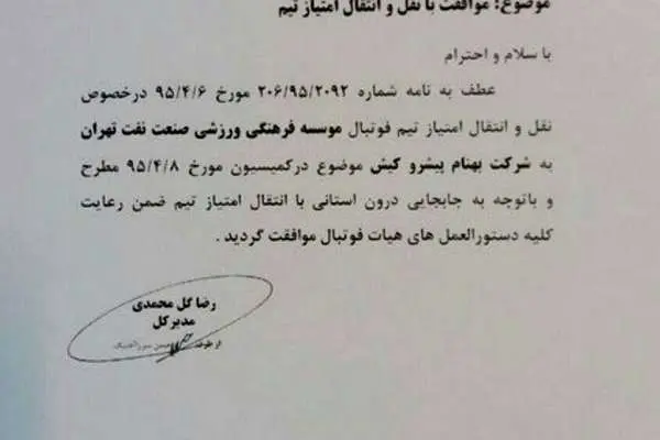 موضوع: موافقت با نقل و انتقال امتیاز تیم