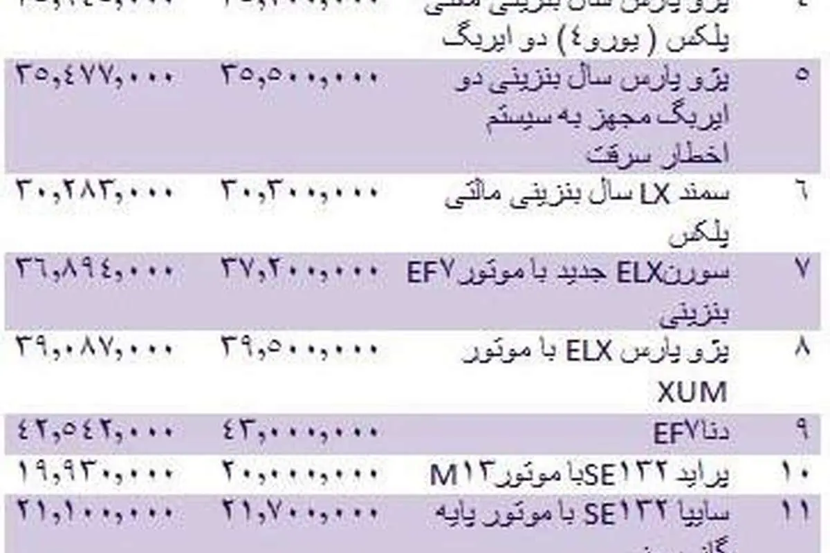 قیمت انواع خودروهای داخلی در بازار