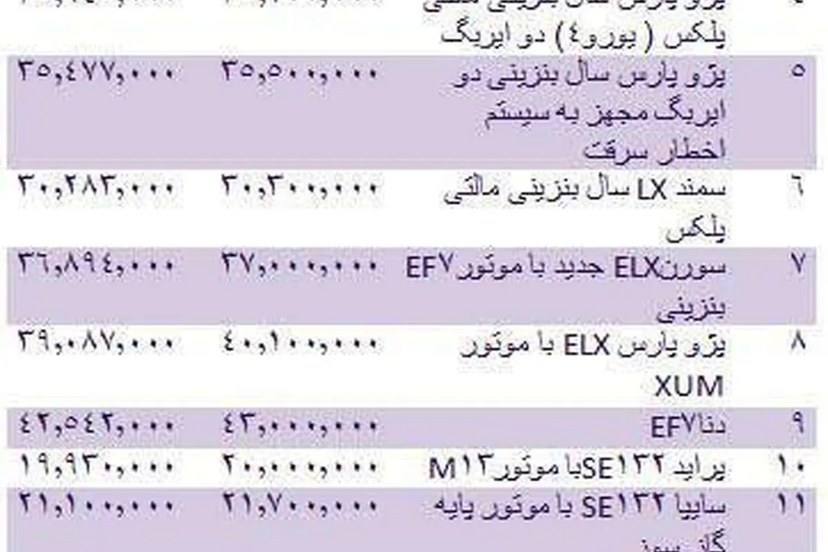 به گزارش باشگاه خبرنگاران جوان، قیمت انواع خودروهای داخلی به شرح جدول زیر است: