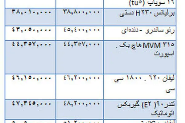 به گزارش باشگاه خبرنگاران جوان، قیمت انواع خودروهای داخلی به شرح جدول زیر است: