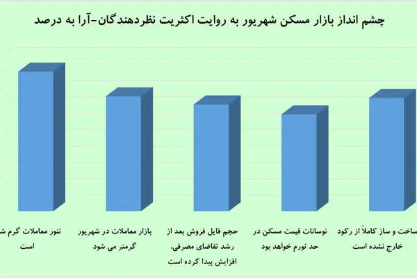 پیش‌بینی 59‌درصد از واسطه‌های ملکی درباره قیمت‌های آتی مسکن نیز بر افزایش نرخ مسکن کمتر یا نهایتا برابر با نرخ تورم (10 درصد) حکایت دارد. این گروه معتقدند بازار کشش چندانی برای تغییر قیمت ندارد اما اگر روند رو به رشد معاملات ادامه یابد،‌ طبعا قیمت‌ها قدری تغییر مثبت خواهد کرد. در مقابل 35 درصد از پاسخگویان قیمت مسکن در نیمه دوم امسال را بدون تغییر نسبت به فصل کنونی پیش‌بینی می‌کنند. در این بین تنها 6 درصد از پاسخگویان به افزایش محسوس قیمت‌ها امید دارند. این گروه مدعی هستند که ثبات قیمت اسمی مسکن به‌رغم تورم انباشته سال‌های گذشته توام با رکود حاکم بر بازار مسکن، زمینه را برای افزایش قیمت آپارتمان مسکونی در سال جاری فراهم کرده است. از طرفی افزایش تقاضای موثر در بازار را به نفع افزایش قیمت توصیف کرده و معتقدند تنها در صورت تغییر محسوس در قیمت‌هاست که بازار فاز پیش‌رونق را طی کرده و به فاز رونق‌نسبی ورود می‌کند. استدلال آنها این است که در صورت ثبات نسبی قیمت‌ها، تمایل خریداران به معامله به بهانه احتمال کاهش قیمت تنزل خواهد یافت. این در حالی است که اکثر شرکت‌کنندگان در نظرسنجی، ثبات نسبی و افزایش تدریجی قیمت‌ها متناسب با شرایط عمومی اقتصاد را به نفع بازار مسکن ارزیابی می‌کنند.