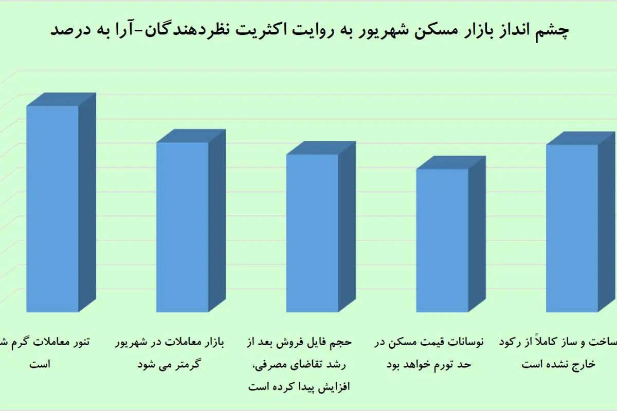 نتایج این نظرسنجی که در قالب 9 پرسش از 50 مشاور املاک انجام شده است، نشان می‌دهد: نبض معاملات مصرفی مسکن در شهریور به‌عنوان ماه طلایی بازار ملک، تحت تاثیر دو نقطه روشن، به نفع «خریدار» سرعت می‌گیرد. اولین برداشت دلالان مسکن نسبت به اوضاع کنونی، از «افزایش تقاضای فروش» حکایت دارد که این موضوع خود بیانگر «مصونیت بازار در کوتاه‌مدت از تورم انتظاری» است. پیش‌تر و طی سه ماه اخیر، بازار شاهد افزایش تقاضای خرید از سمت مصرف‌کننده‌ها بود اما هم‌اکنون هر دو سمت بازار برای انجام معامله، اشتیاق نشان می‌دهند. 65 درصد مشاوران املاک از افزایش فایل فروش خبر می‌دهند.