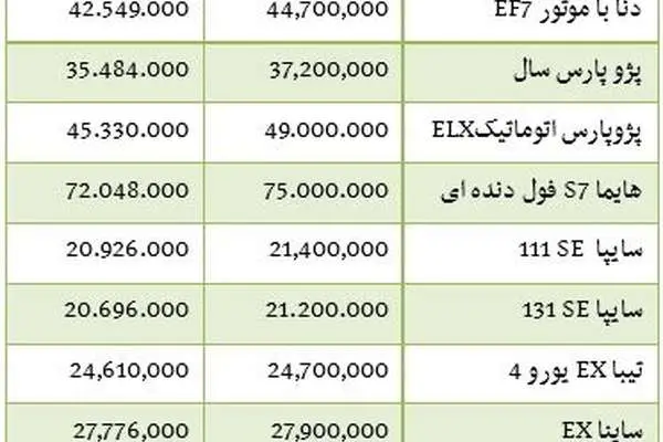 قیمت برخی از خودرو های داخلی در بازار به شرح زیر است: