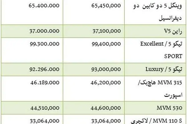 قیمت برخی از خودروهای داخلی به شرح جدول زیر است :