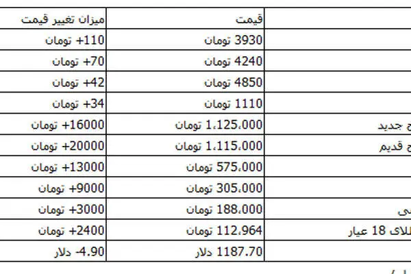 همچنین سکه طرح جدید با 16 هزار تومان افزایش یک میلیون و 125 هزار تومان، طرح قدیم با 20 هزار تومان رشد یک میلیون و 115 هزار تومان و نیم سکه هم با 13 هزار تومان افزایش 575 هزار تومان به فروش میرسد.