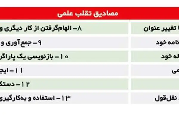 ارائه برخي از آثار علمي، مانند پاياننامه، رساله و مقاله به دانشگاهها و مؤسسات آموزشعالي و پژوهشي، منتهي به اخذ مدرک دانشگاهي يا ارتقاي رتبه علمي ميشود؛ بنابراين ميتوان اين نوع تقلب را به نوعي، جعل مدارک دانشگاهي و علمي و فاقد اعتبار دانست.