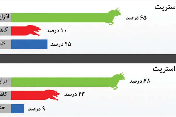 221 نفر معادل 23 درصد، کاهش قیمتها را در هفته کاری جدید که از امروز دوشنبه آغاز میشود، پیشبینی کردهاند. 92 نفر معادل 9 درصد هم نظری خنثی داشتهاند.