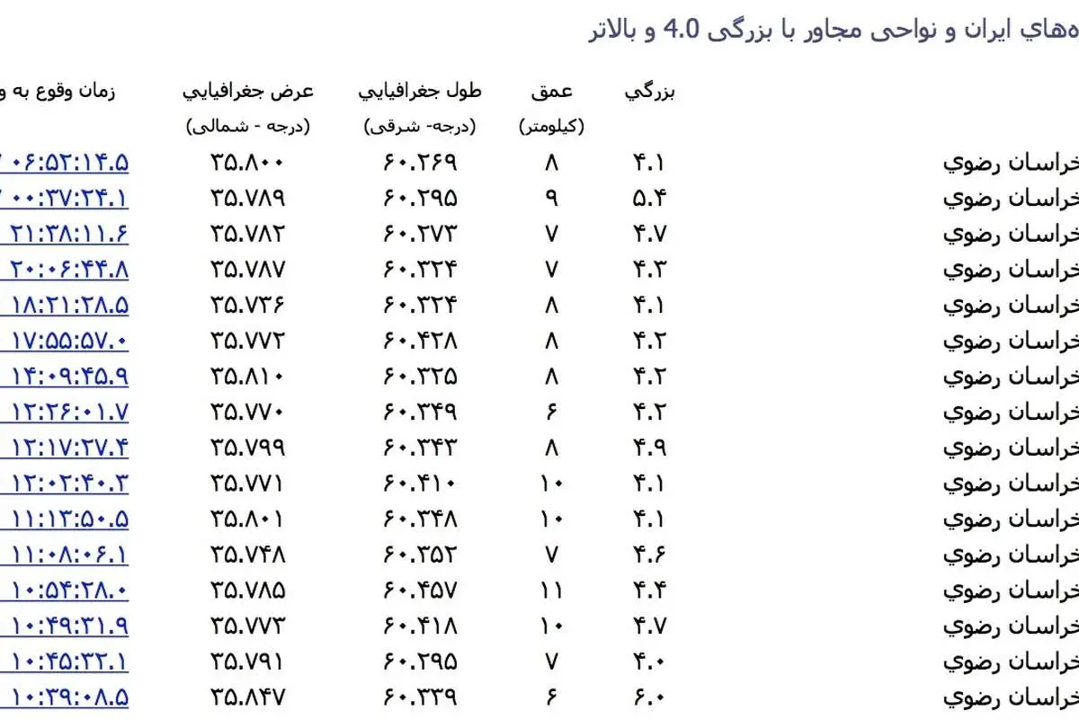 به گزارش خبرآنلاین؛ هرچند که خوشبختانه خسارتهای زلزله ۶ریشتری ساعت ۱۰:۳۹ دیروز در سفیدسنگ فریمان، در ۸۰ کلیومتری مشهد، زیاد نبود، اما این منطقه هنوز هم میلرزد. از دیشب تاکنون فقط دو پسلرزه بزرگتر از ۴ ریشتر سفیدسنگ و مشهد را لرزانده است، یکی ۵.۴ ریشتری که ۳۷ دقیقه بامداد به وقوع پیوست و البته بزرگترین پسلرزه زلزله ۶ریشتری بود و دیگری هم ۶:۵۲ صبح امروز که ۴.۱ ریشتر قدرت داشت؛