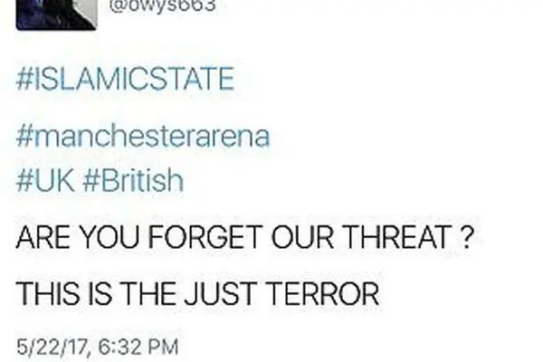 در یکی از این پستها در توئیتر که وقوع انفجار و حمله در منچستر را پیش بینی کرده بودند و توسط کاربری به نام "عبدالحق" منتشر شده، آمده است: به نظر میرسد که بمبهای نیروهای هوایی انگلیس بر سر کودکان موصل و رقه اکنون به منچستر بازگشتهاند.
