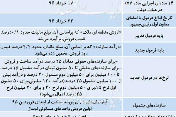 نحوه محاسبه و اعمال فرمول جدید «مالیات بر ساخت و فروش مسکن»، 5 روز پس از تصویب آیین‌نامه مربوط به آن در هیات دولت، با انتشار متن کامل مصوبه، مشخص شد. گزارش «دنیای اقتصاد» از جزئیات کامل آنچه در قالب آیین‌نامه اجرایی ماده 77 قانون جدید مالیات‌های مستقیم به تصویب هیات دولت رسیده، حاکی است: در کلیه مناطق شهری کشور، همه سازنده‌های مسکن از طیف‌های مختلف شامل «سازنده‌های حقیقی یا همان شخصی‌سازها، بساز و بفروش‌ها و تعاونی‌های مسکن» و همچنین «سازنده‌های حقوقی یا همان شرکت‌های ساختمانی و انبوه‌سازان» مکلفند برای فروش آپارتمان‌هایی که پروانه‌ساخت آنها از ابتدای سال 95 به بعد صادر شده، مبلغ «مالیات بر ساخت و فروش موضوع ماده 77» را بر اساس فرمول جدید به ادارات مالیاتی پرداخت کنند.