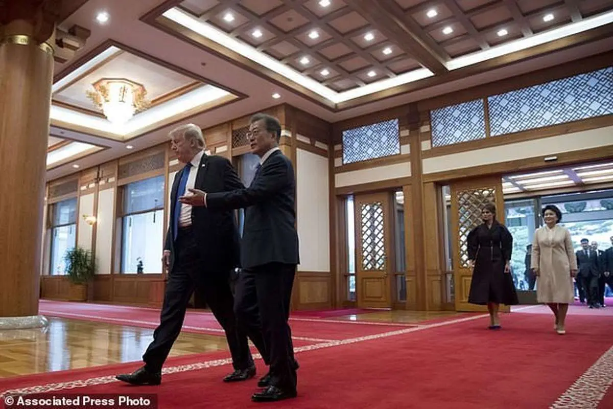 رئیسجمهور آمریکا از مون جائه این علت آنچه که او "همکاری فراوان" به رغم اختلافات در مورد چگونگی رویارویی با کره شمالی و بر سر یک توافق تجاری میان کشورهایشان خواند، تحسین کرد. هنگامی که این دو رهبر مذاکرات رسمی خود را بعد از یک مراسم استقبال در نزدیکی کاخ ریاست جمهوری کره جنوبی در سئول برگزار کردند، مون جائه این به ترامپ گفت، امیدوار است که سفر او باعث کاهش نگرانی مردم کره جنوبی درمورد کره شمالی شده و تبدیل به یک نقطه عطف در حل مساله هستهای کره شمالی شود.